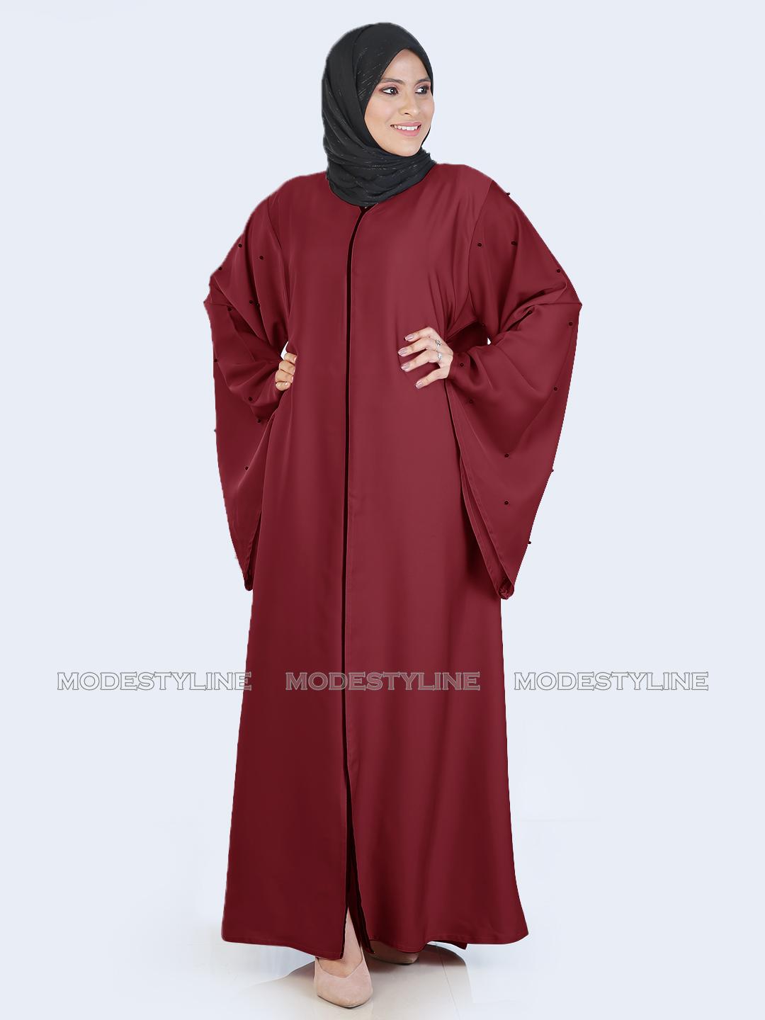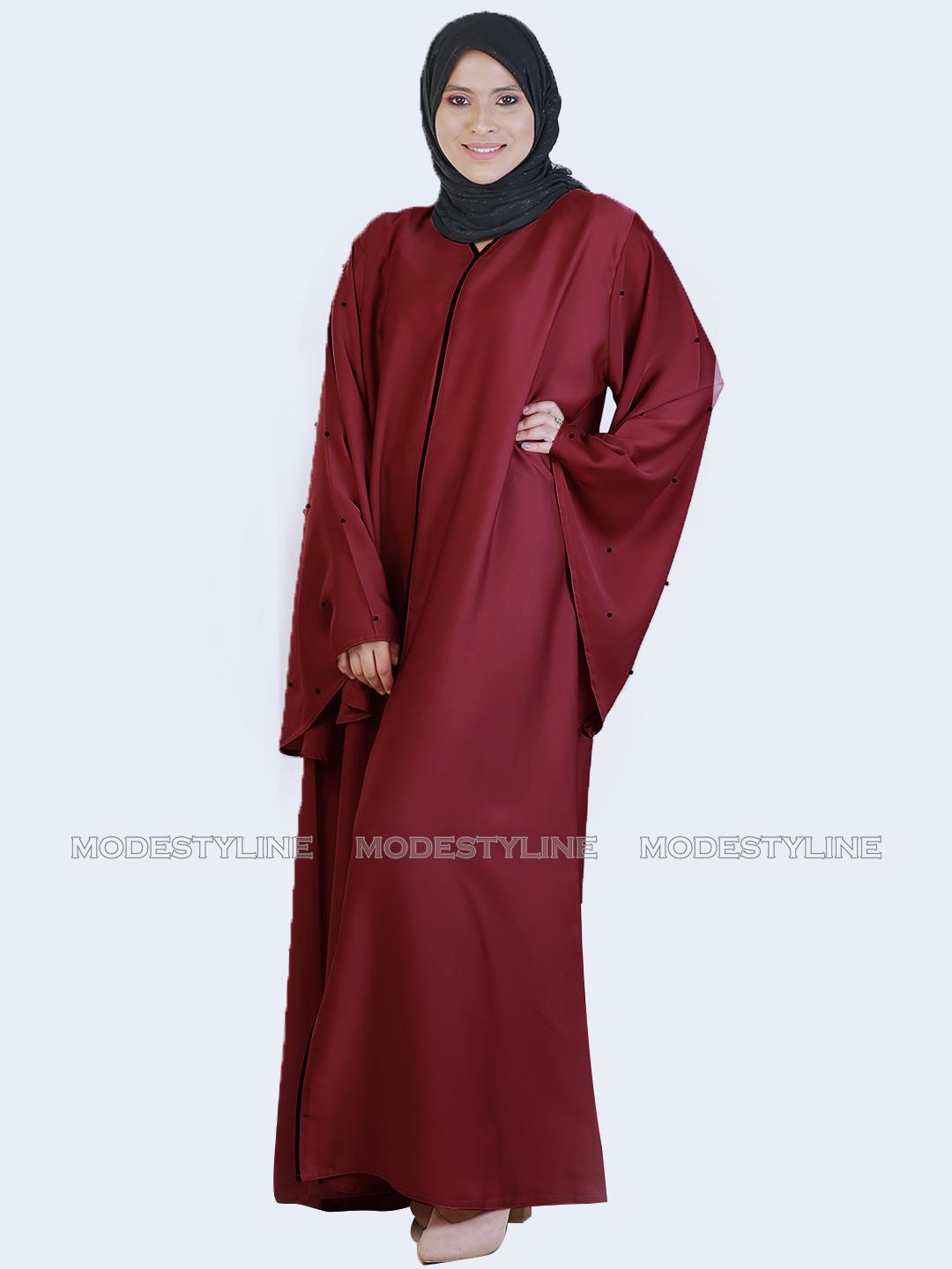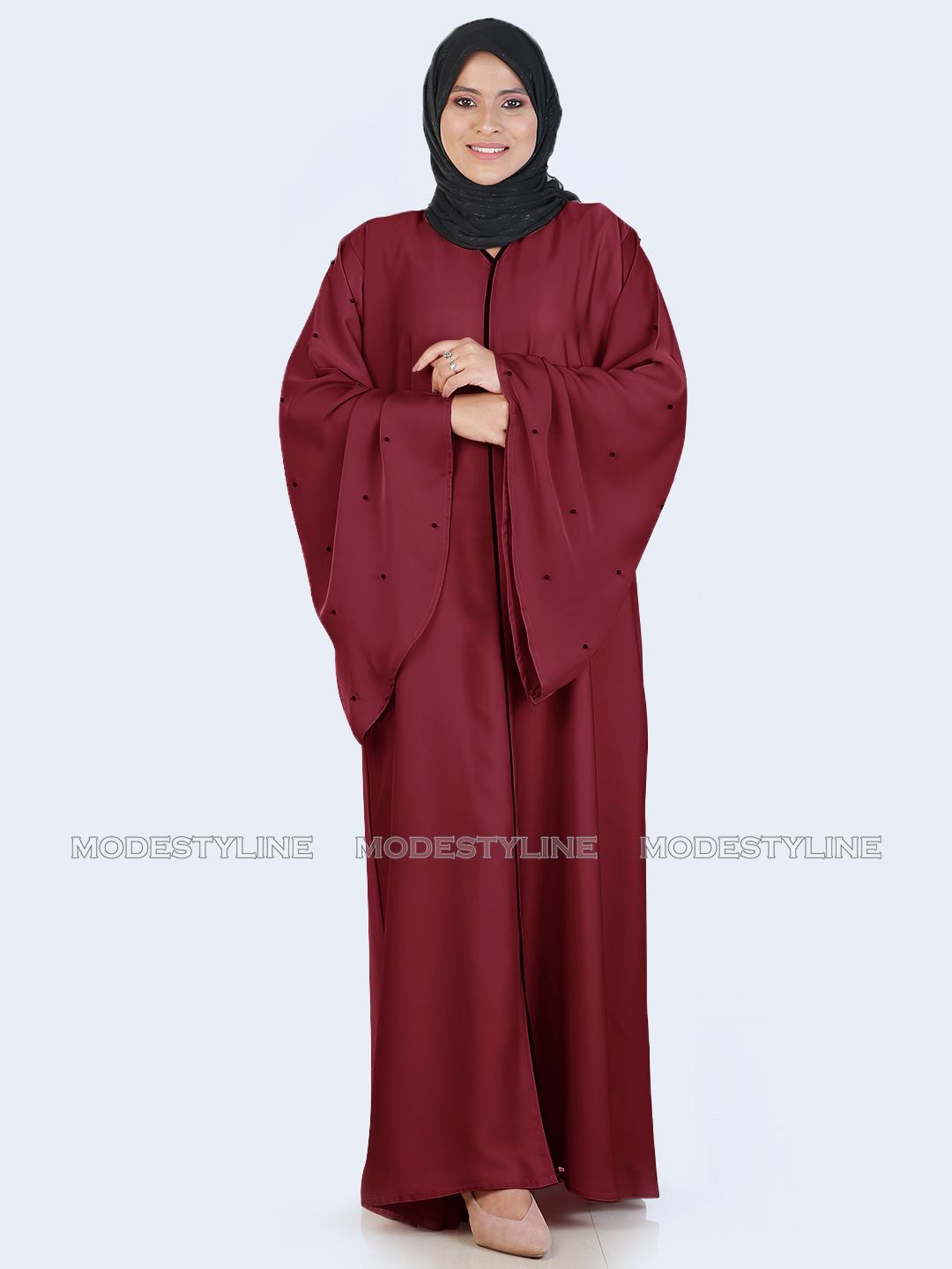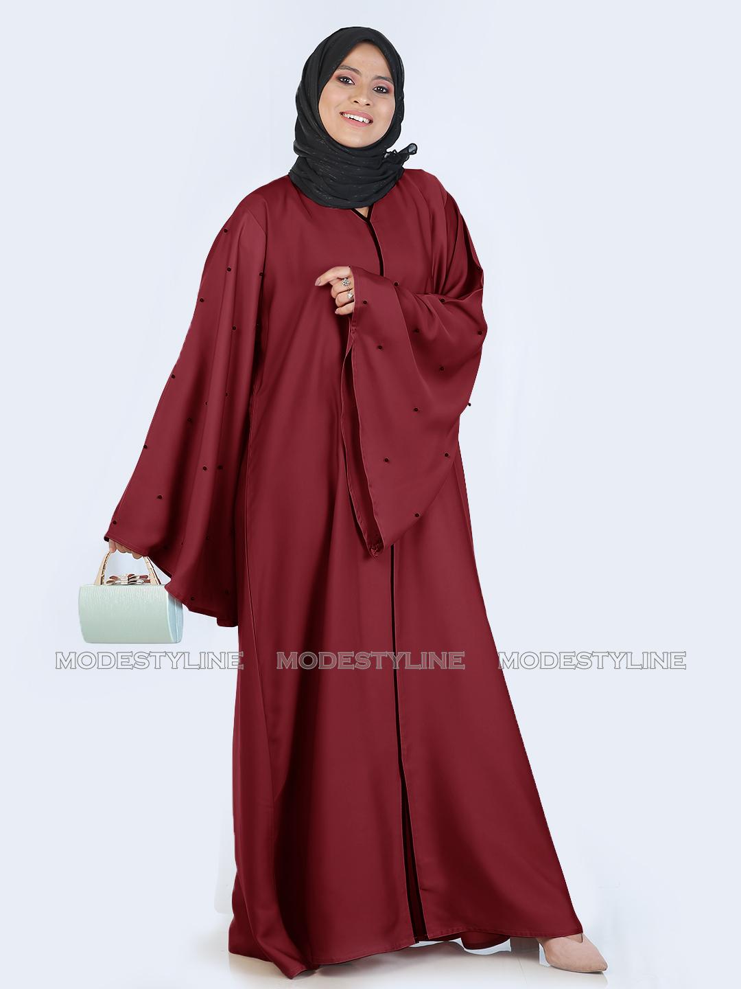 Trumpet sleeves Maroon Beaded Abaya with hijab