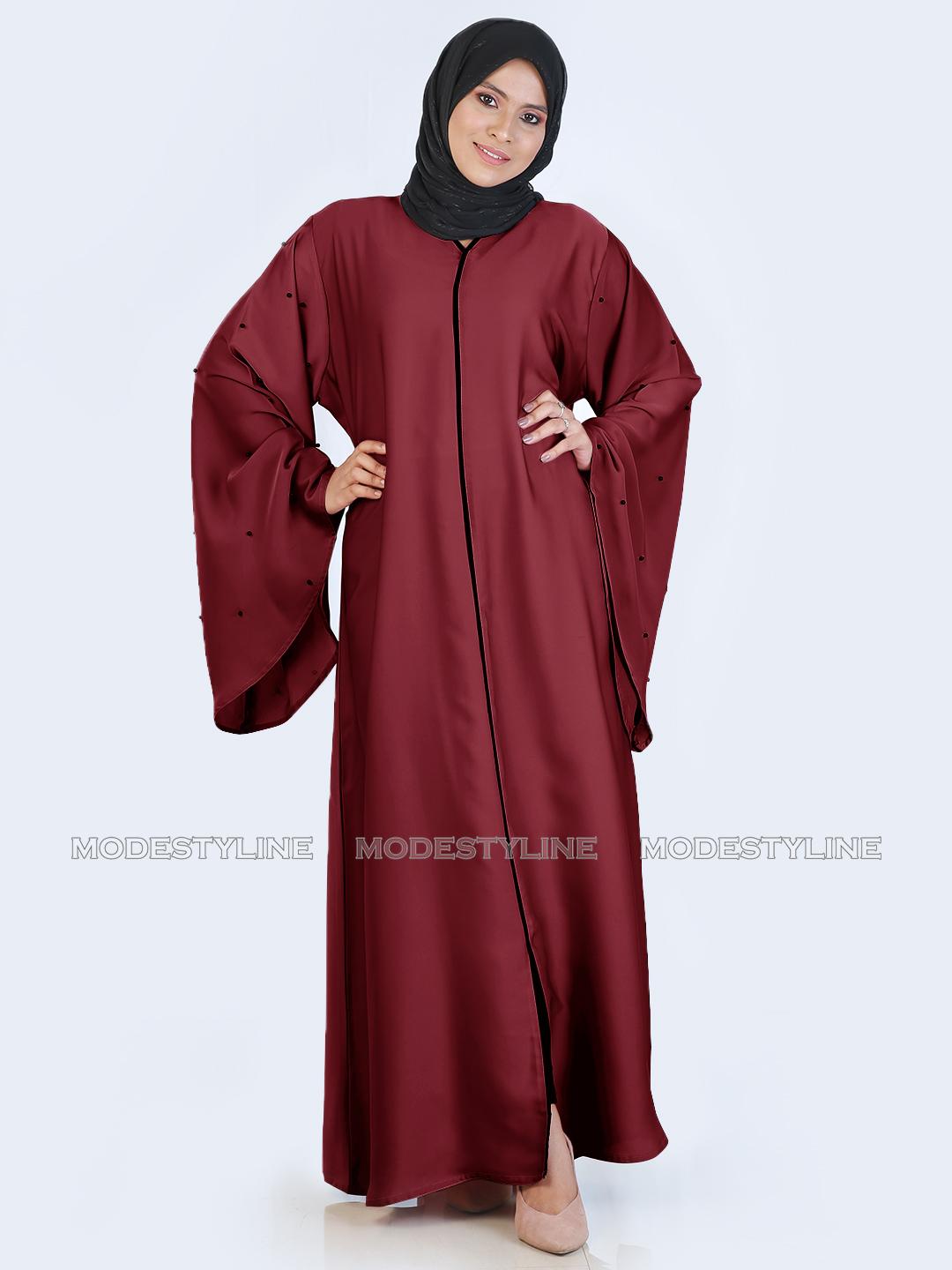 • Trumpet sleeves Beaded Abaya in Maroon with black piping for a stylish contrast.